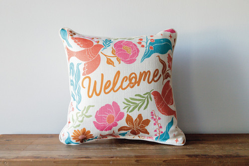 Welcome with Birds and Flowers Throw Pillow